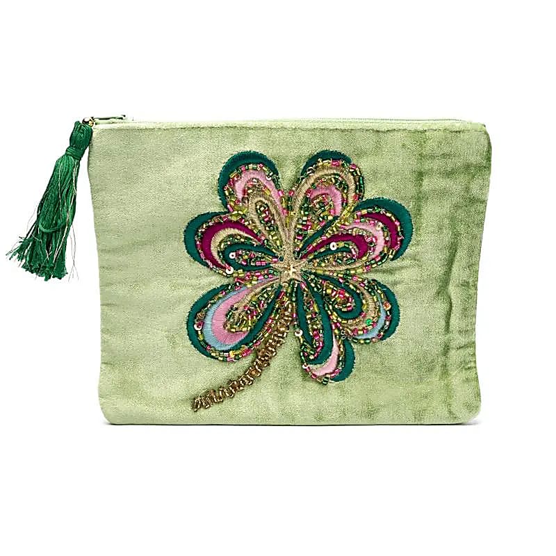 Pochette zippée en velours vert avec trèfle à quatre feuilles
